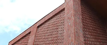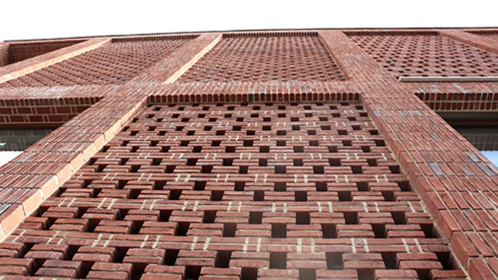 Le maçonnage spécifique de la façade, avec une brique de parement rouge-bleu plutôt classique et un jointoiement blanc, donne à l'école un aspect atypique qui s'intègre parfaitement aux bâtiments environnants.