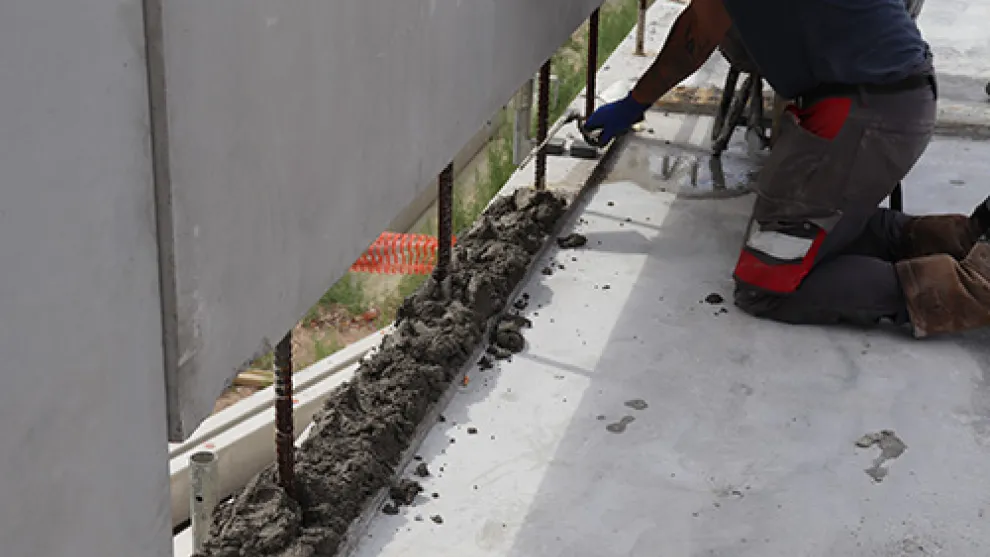 Les travaux sont effectués étage par étage ; les murs en béton préfabriqués étant placés sur la dalle de béton et le mortier