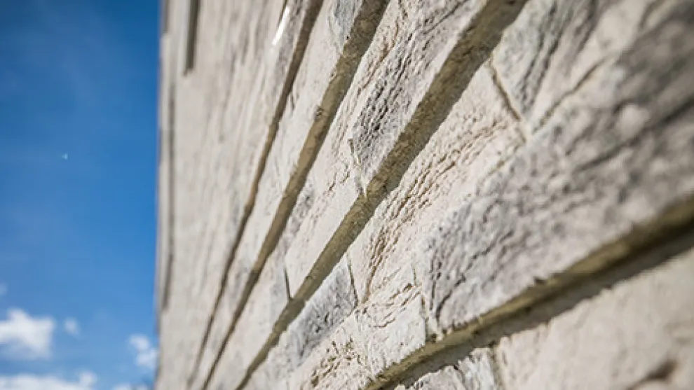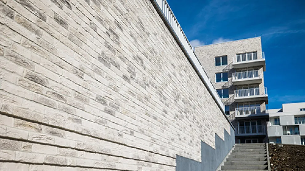 Aannemersbedrijf BPC, die in staat voor de ruwbouwwerken, metselde de wit-donkergrijs genuanceerde gevelsteen ‘Lima’ van Vandersanden met onze bijpassende dunbedmortel Mur 12 DBM extra wit – 002.