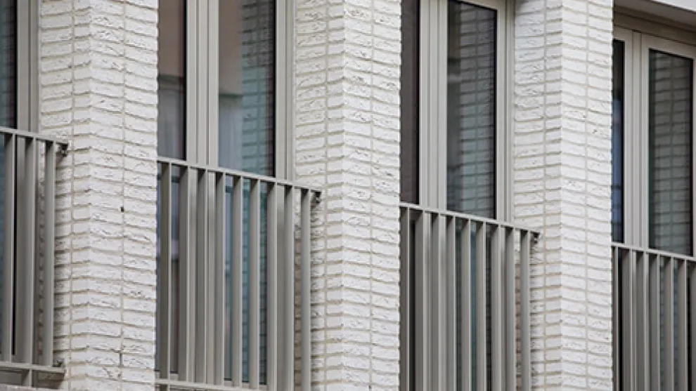 Het gedeelte in de Stijfselrui werd uitgevoerd in een gele genuanceerde baksteen ‘South Carolina 1581’ uit de Deppe Backsteincollectie van Heylen Ceramics en beton.
